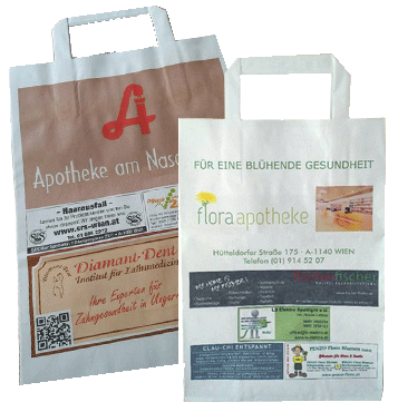 Ambient Werbung im Umfeld des Point of Sale auf Papier-Tragetaschen für Apotheken und Bäckereien.